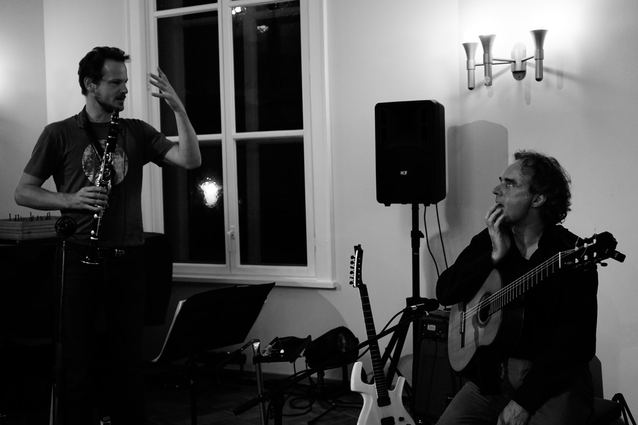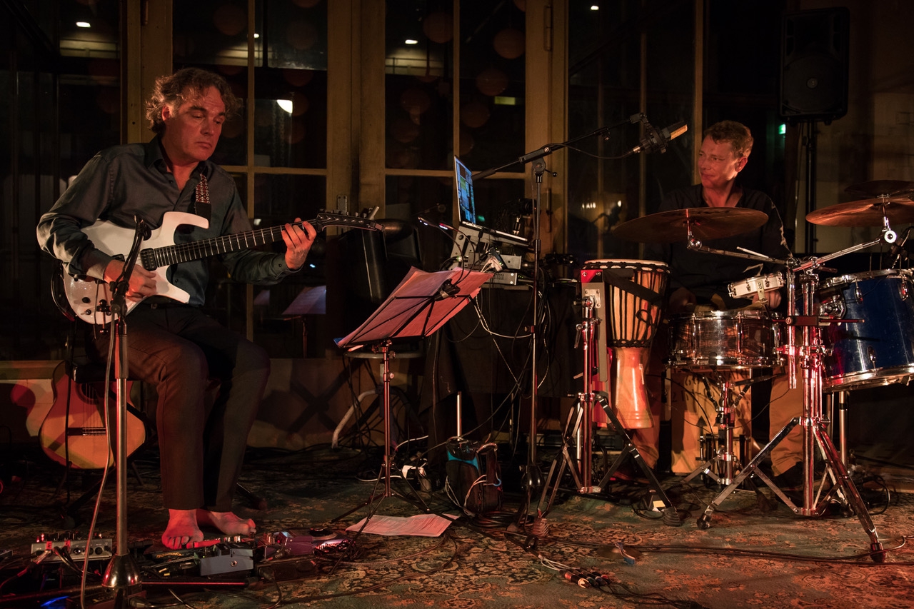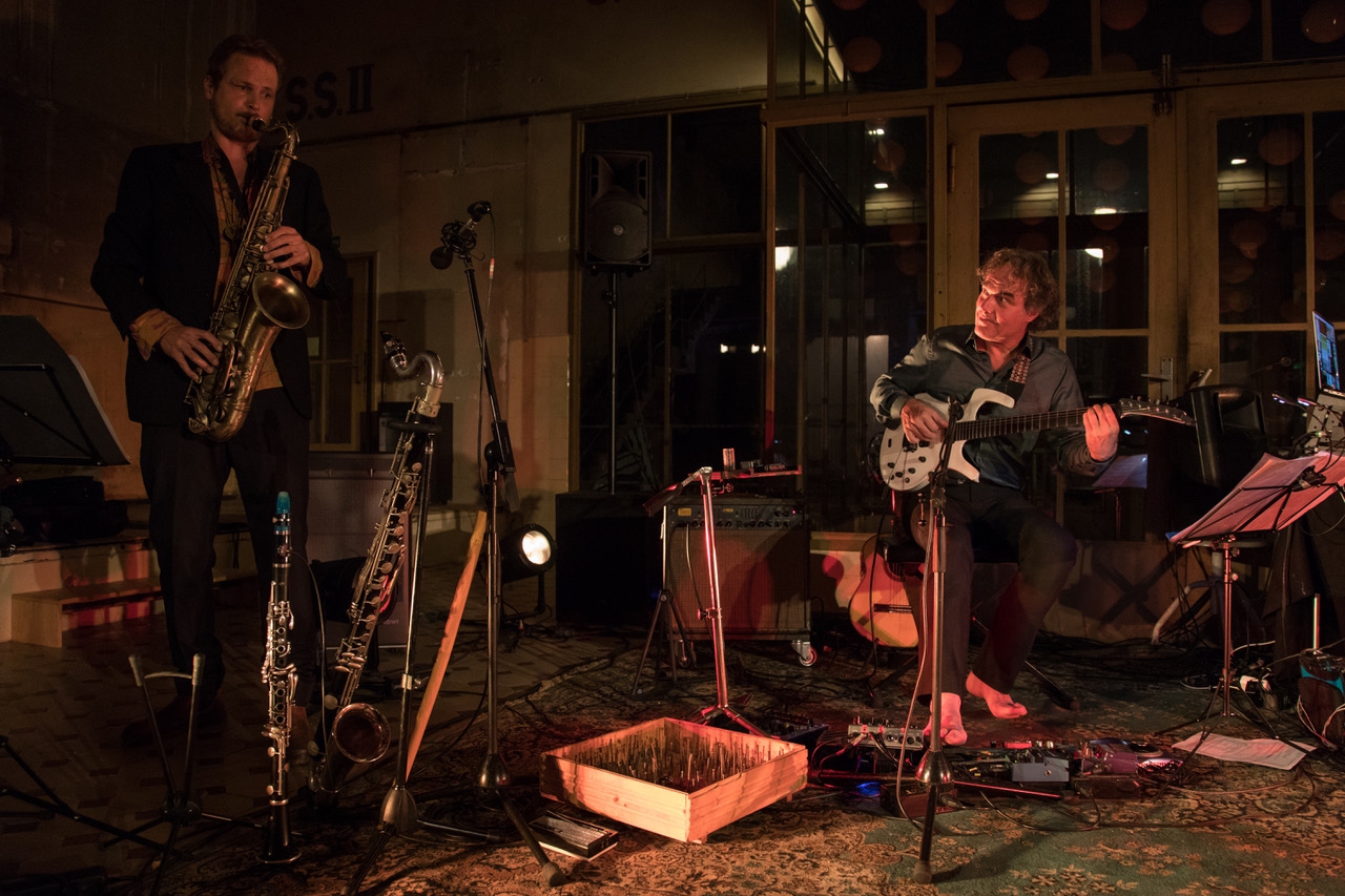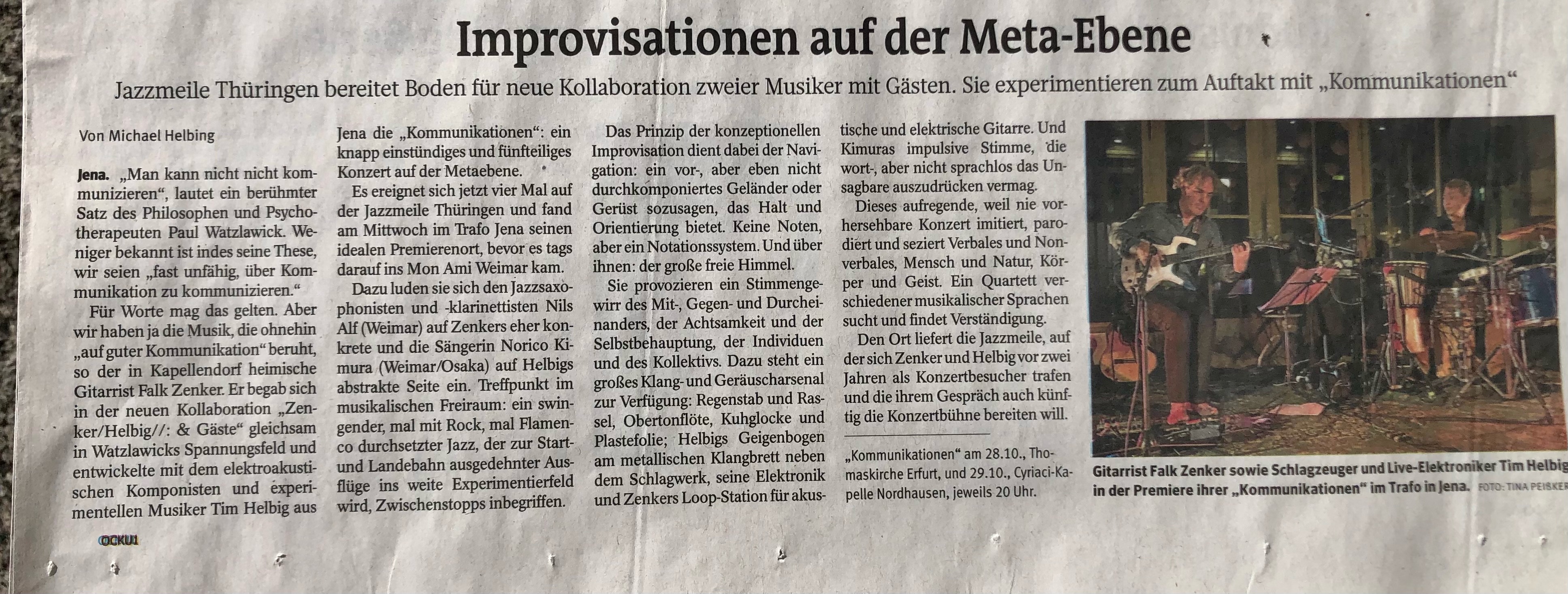 Die gegenwärtigen Zeiten bedürfen neuer Wege. Dies meinten zwei kreative Köpfe der Thüringer Jazz- und Improvisations-Szene, Gitarrist Falk Zenker und Perkussionist und Klang-Elektroniker Tim Helbig und gründeten ihr neues Duo-Projekt Zenker/Helbig//:. In Kombination aus Zenkers virtuoser Gitarren-Loop-Kunst und Helbigs abgefahrenen Instrumentenerfindungen und komplexer Live-Elektronik erforscht das Duo mit großer musikalischer Spiel- und Experimentierlust neues musikalisches Terrain.